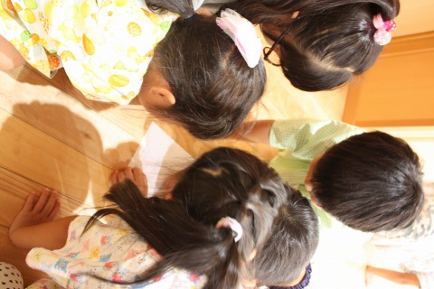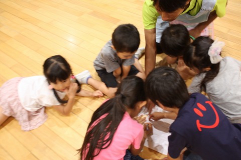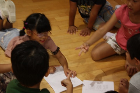 ひみつのひみつの話し合い。誰が何番目に走るのかをチームで相談しています。時にはジャンケンをしたり、なかなか決まらなかったりもします。