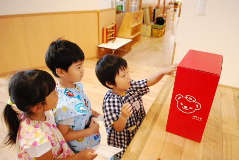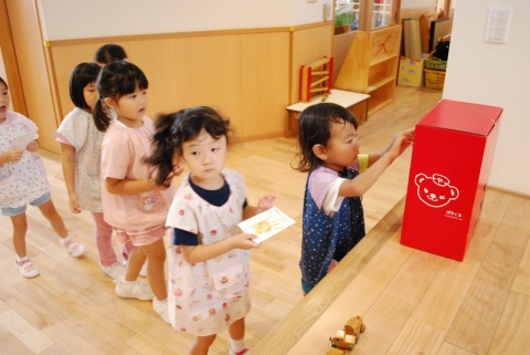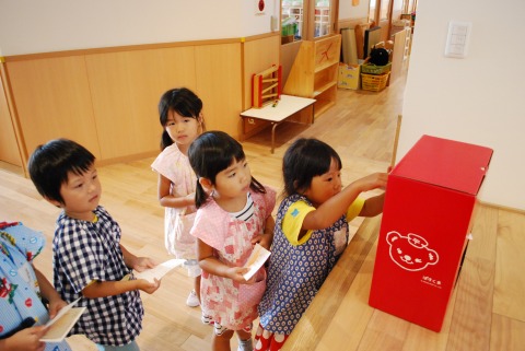 朝体操後、保育室でゲームをして遊び、その後、敬老の日に届くように、はがきに絵を描いたものを「ぽすくま」のポストに投函しました。きっと、土曜日辺りには届くことと思います。