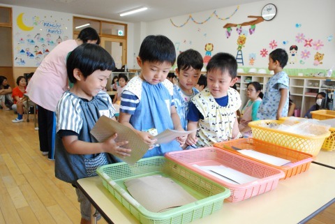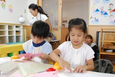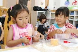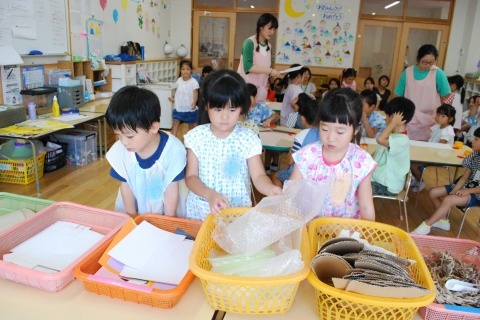 凹凸したところにインクをつけて、こすりだすと写し出されるというイメージが難しいようでした。が、紙の素材を手で触って確かめ選ぶと、躊躇していたはさみの動きがスムーズに動き始め、切った物をのりで貼りました。時間がかかる作業なので、途中ではありましたが、今日の製作は終了となりました。明日からまた製作し、刷りあがりましたら、ぜひ、鑑賞しに保育室にお越しください。