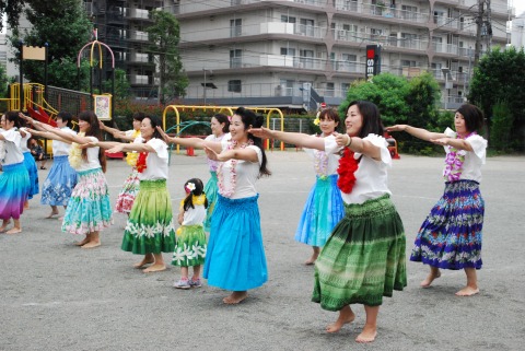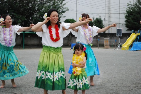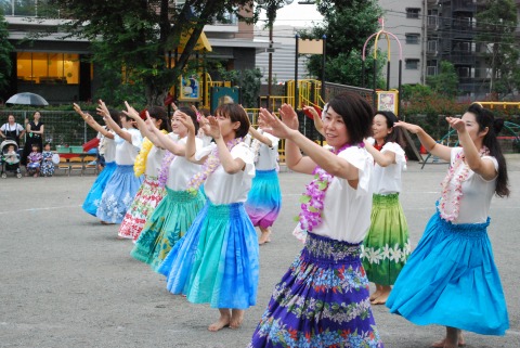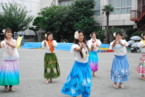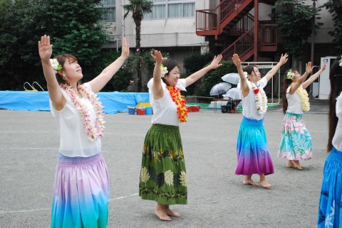 みんなが大好きな「エビカニクス音頭」を踊っていたら、ポツポツと雨が降ってきたので、ウッドデッキに避難しました。その間、フラ同好会のフラガールさんたちがダンスを披露してくださいました。