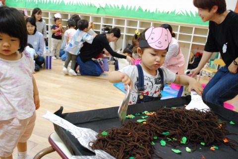 屋台のセッティングをすると、お財布を握りしめて、5つのお店を回りました。焼きそば屋さんでは、フライ返しを両手に持って、焼きそばを焼くことをみんな喜んで体験しました。魚釣りでは、釣れた魚を4匹持ち帰ることができました。