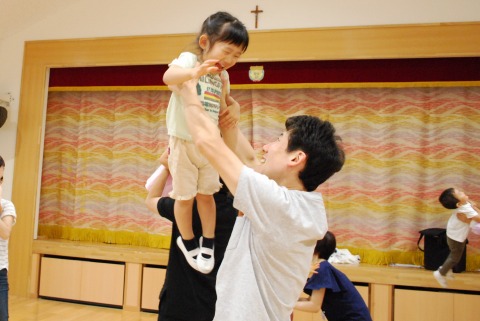 今日のてんしぐみは水遊びの予定でしたが、残念ながら気温は上がらず、どんよりとしたお天気でしたので、ホールでのふれあい遊びをしました。