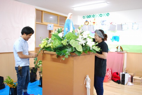 昨年度、近隣の公共施設へのお裾分けの花束作りを、おかあさん方に手伝っていただきました。その中にフローリストママさんがいらっしゃって、そのセンス✨に驚かされました。「来年度の山車をお願いできたらすてきだな…」と思いつき、無理なお願いをして今日に至りました。