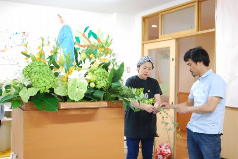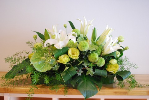 祭壇のアレンジメント。ドラセナをくるっと丸めるとボリューム感がでました。