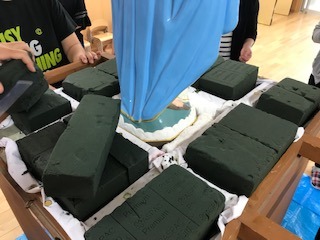 ①マリア様の山車にオアシスを敷き詰めました。