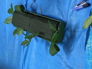 ②マリア様とオアシスが動かないように紐で固定し、レモンリーフを生けました。