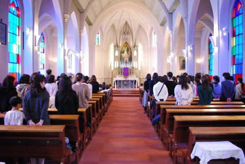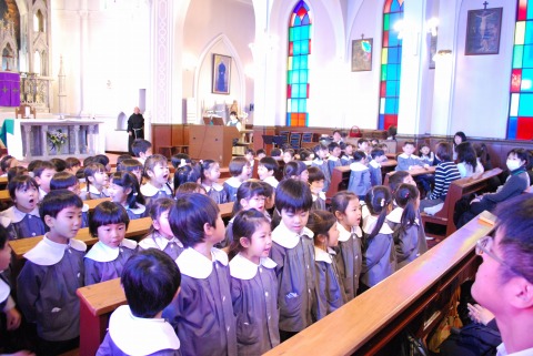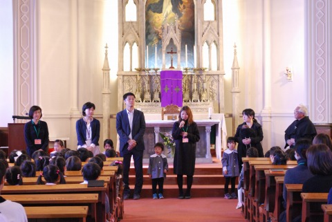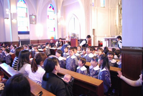年長児が卒園し、教会に集まった年少・年中児は90人弱。いつもは狭く感じる教会が、今日はとても広く感じました。平成30年度の修了式を行いました。