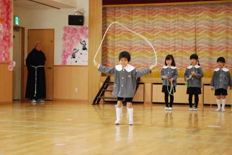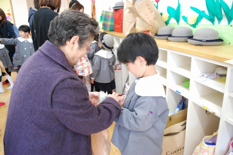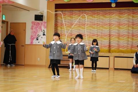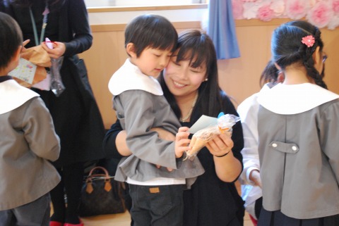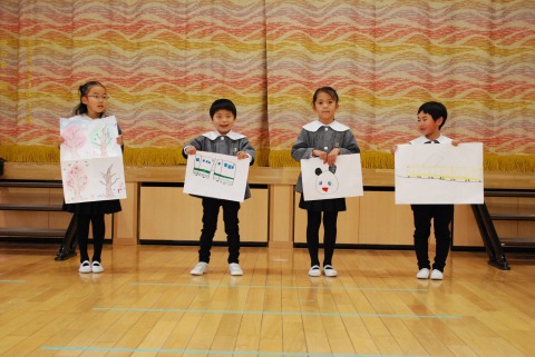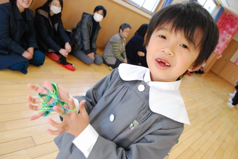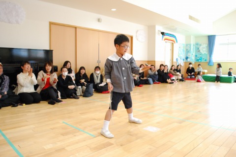 教会での祝福式の後、ホールに集まり、「お楽しみ会」を行いました。「卒園をお祝いする会」では、おかあさん方が歌やダンスを披露してくれました。今日は、子どもたちがやりたいことを選んで発表しました。