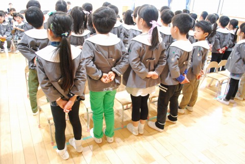 「お別れの言葉」を聞く年中児。