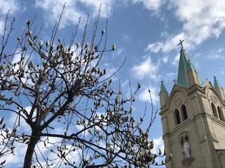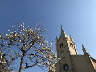 教会の脇の梅の花がほころび、もくれんのつぼみがふっくらとふくらみました。