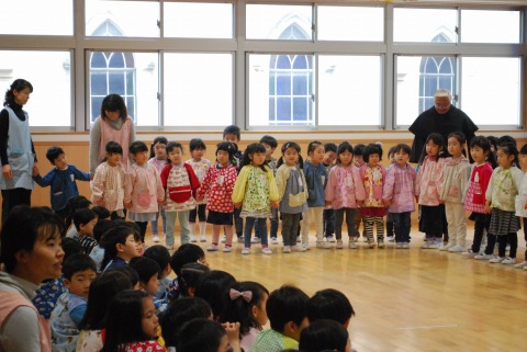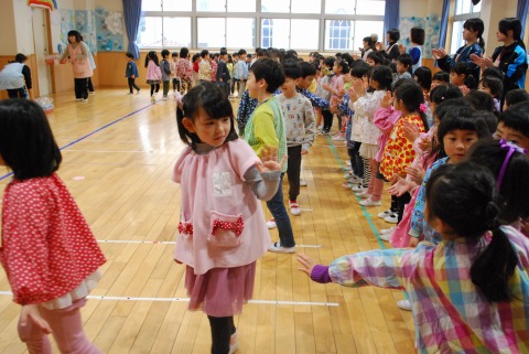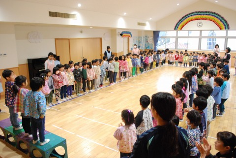 幼稚園のリーダーとして、日々の保育や行事で率先して活動していた年長さんのお別れ会を行いました。右手が年中組。奥が年少組。左手が年長組です。