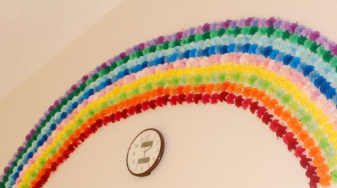 9のクラスカラー、赤・橙・黄緑・黄・桃・青・水色・緑・紫の花を50個ずつ作って虹にしてくださったとのことでした。