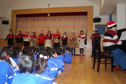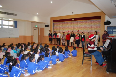 母の会同好会のコーラスサークル「マドンナ」さんが、子どもたちにクリスマスソングを聞かせてくださいました。