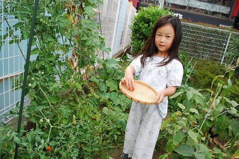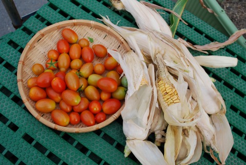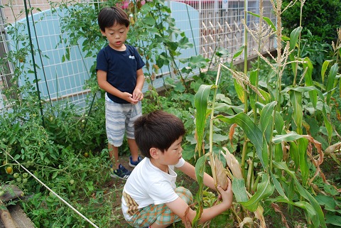 幼稚園の小さな畑でできた、ミニトマトとトウモロコシの収穫