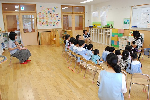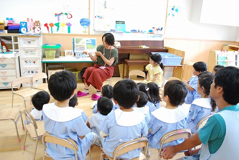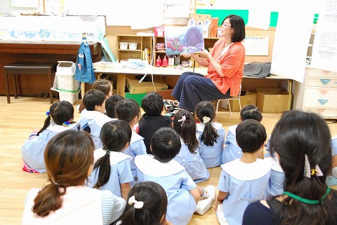 聖母の騎士幼稚園には、保護者の方の同好会があります。絵本同好会は、年間16回位、降園前に読み聞かせをしてくださいます。「今日は、誰のおかあさんがくるのかな…?」と子どもたちは楽しみにしています。13時30分、降園前の至福の時。