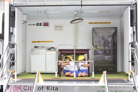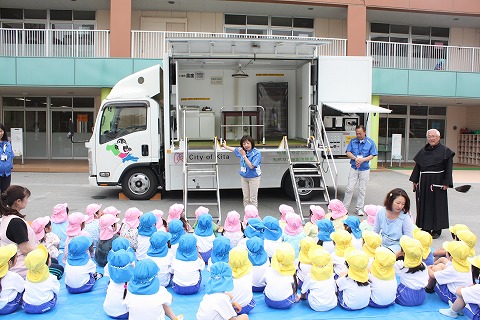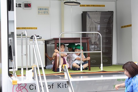 起震車体験(年中組・年長組) 2018年5月30日2020年9月15日 聖母の騎士幼稚園行事レポート 2018年5月30日(水) 北区役所から起震車体験のなまず号がきました。 地震の時の約束を聞いて、震度6を体験。テーブルの脚にしがみついたけれど、怖くて、なにもできませんでした。