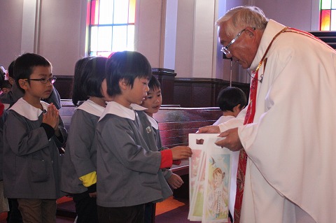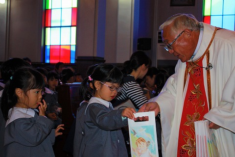 子どもたちの成長を祝う七五三。本園では今年該当する子どもたちだけではなく、全園児の成長を神さまに感謝し、お祝いします。園児たちは皆、神父様から祝福して頂き、その後、千歳飴をいただきました。