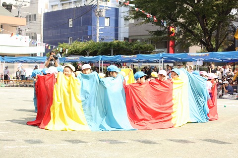 3クラスで協力して2つの大きな布を操り、素敵な演技を見せてくれました。