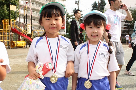 運動会を終えて、先生から金メダルとおみやげを頂いた園児たち。