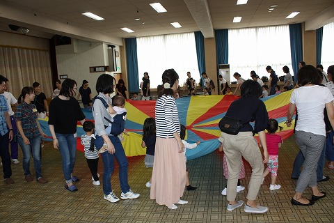 子どもたちも保護者の皆様も、このカラフルで大きな布に少し驚きながらも、興味津々!