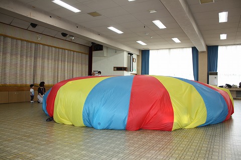 この布の正体は、年中組の子どもたちが運動会で行う「パラバルーン」。園児たちがこの布を使って行う演目は、見応えがあり、毎年会場を沸かせます。今日はみんなでこの「パラバルーン」に挑戦します!