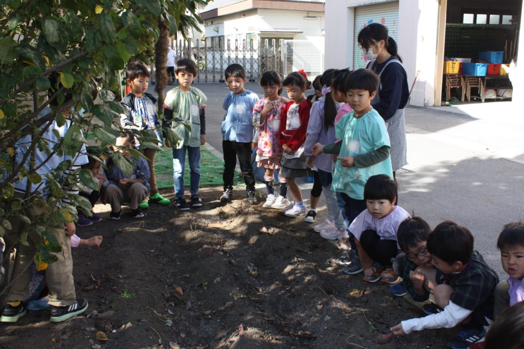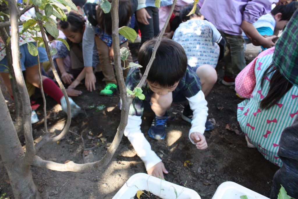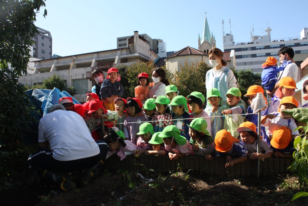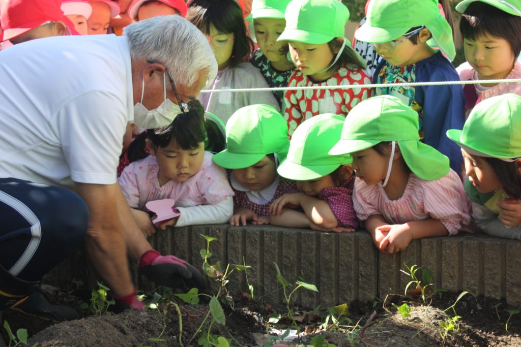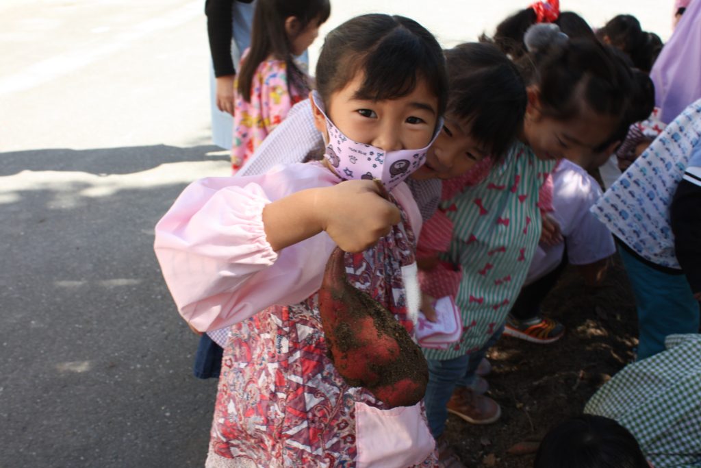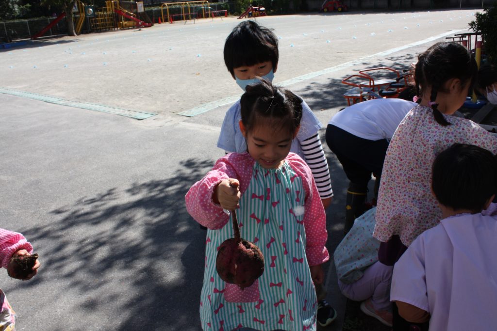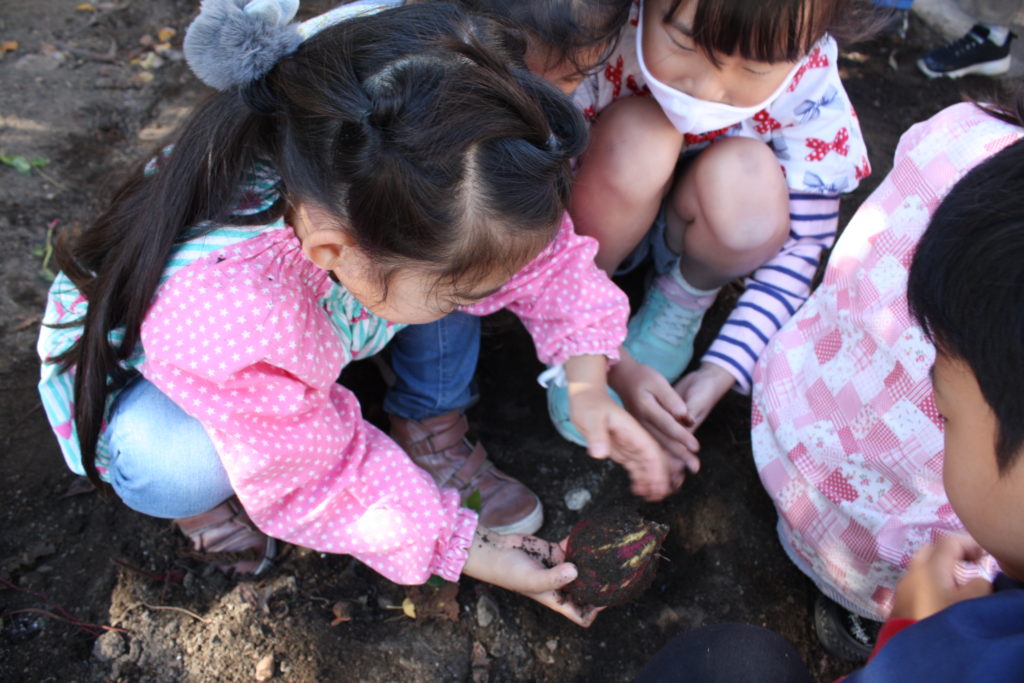おいもほり 2020年10月29日2020年11月1日 聖母の騎士幼稚園行事レポート 2020年10月29日(木) 年間予定表では、今日はおいもほりの日でした。バスに乗って、むさしの村に行ってお芋を掘る予定でした・・・ 実は小さいですが、幼稚園にも畑があります。暑い夏を乗り切り、土の中でむくむくと大きくなったおいもとご対面の時を迎えました!! 少しだけでしたが、実りの秋の収穫体験を味わうことができました。年少組・年中組は見学(数人の子が体験)をし、年長組は実際に掘りました。(年中組の写真が撮れませんでした。