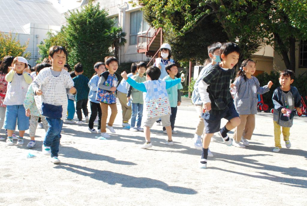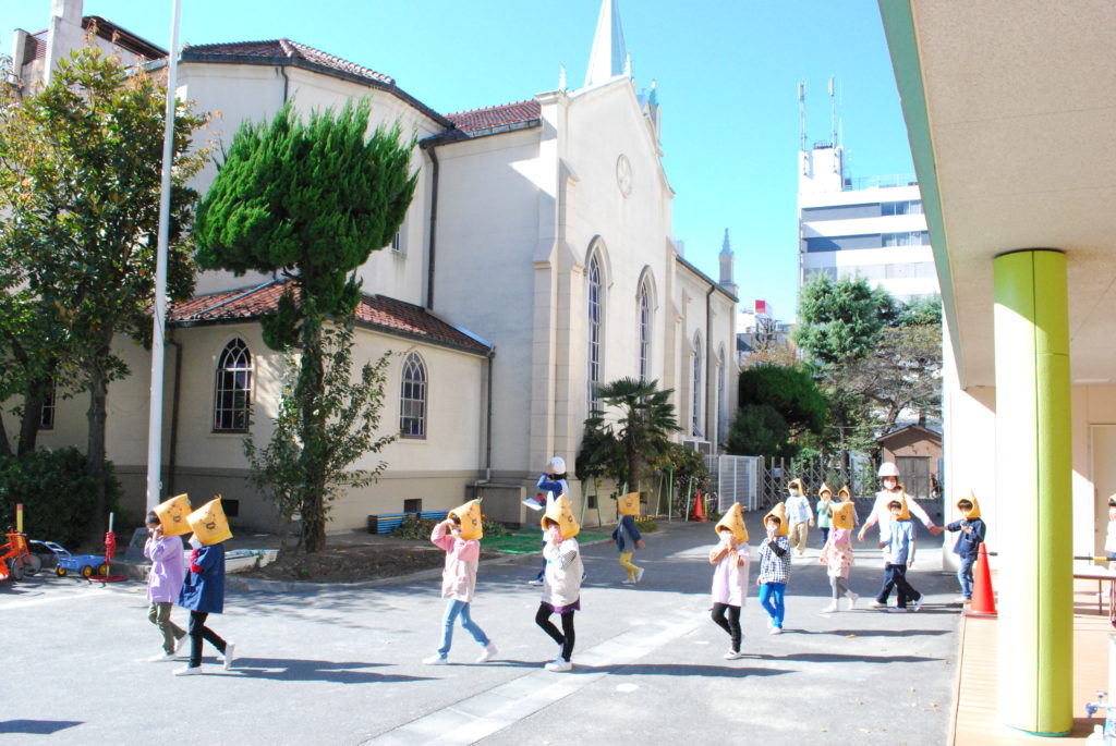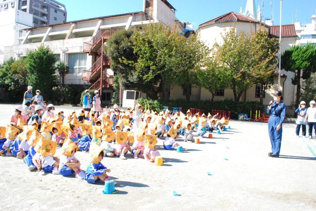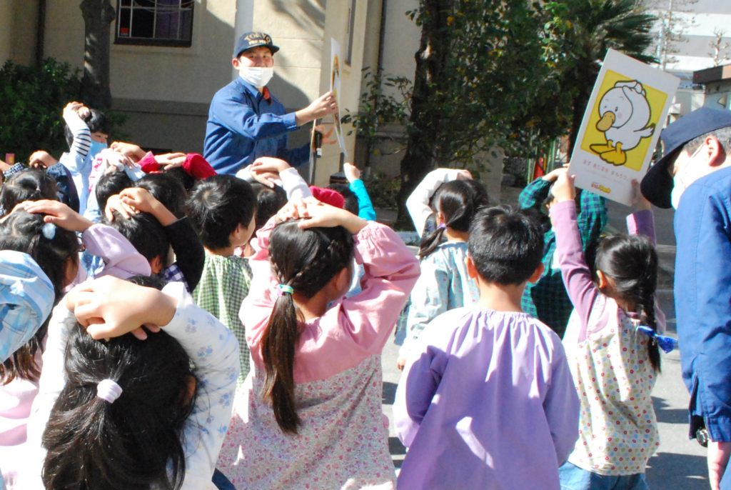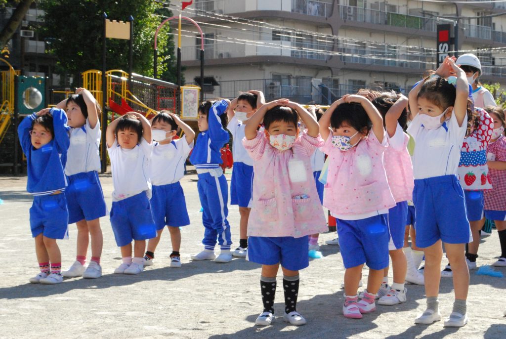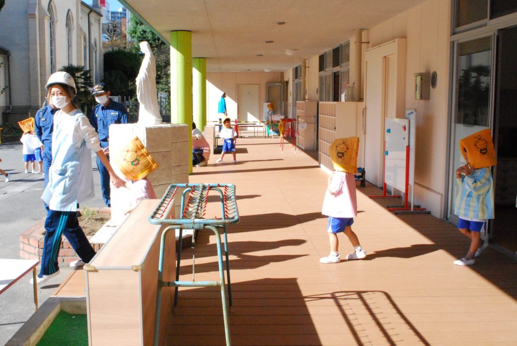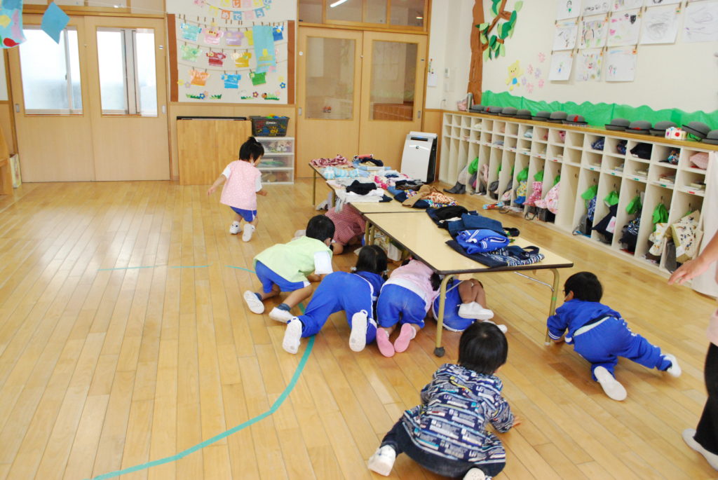「避難訓練です。地震です。近くの先生のところに集まりましょう」という放送が流れ、すぐに机の下にもぐり、その後、園庭に避難しました。