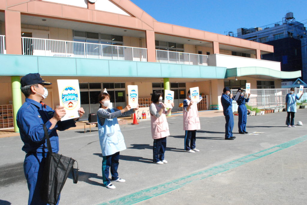 2ヶ月に1回、避難訓練を行っています。今日は、赤羽消防署の消防士さんと一緒に訓練を行いました。